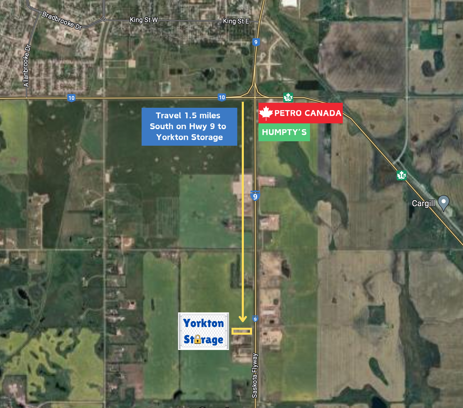 Yorkton Storage is a locally owned and operated business. We are located off Highway #9 just 1.5 miles south of the Petro Canada and Humpty's (at the intersection of Highway #16 & Highway #9).